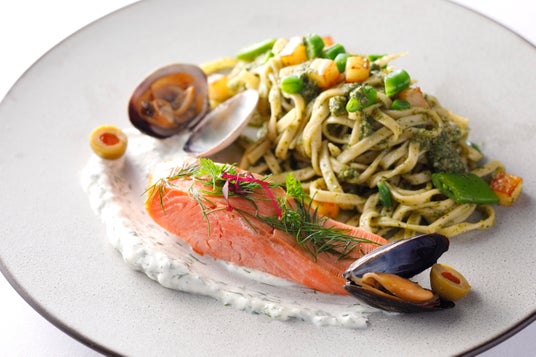 ジェノベーゼソースのパスタ 貝の旨味でマリネした青森県産“海峡サーモン”とともに