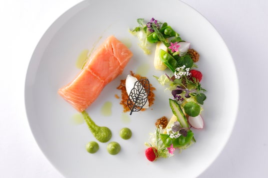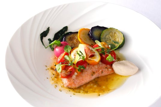 青森県産“海峡サーモン”のコンフィ サワークリーム添え ズッキーニとバジルのクーリー トリュフ香る季節野菜のサラダ仕立て