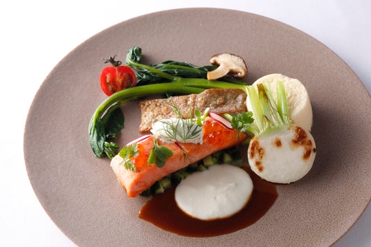 青森県産“海峡サーモン”のミキュイ “野辺地葉つきこかぶ”のソテーとフランを添えて