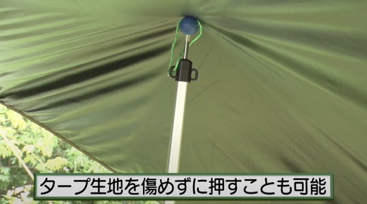 また「ポールエンドロック」の向きを変えることで、タープの生地を傷めずに押すことも可能。天井に溜まった雨水などを流すことも可能です。