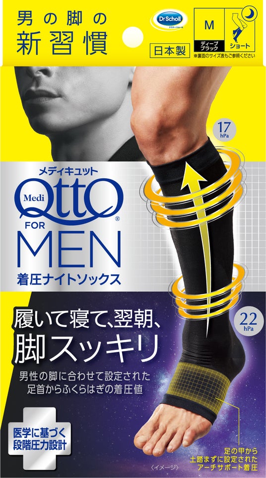 2023年に登場し、発売3ヶ月で出荷数10万本を突破した男性用の着圧ソックス「メディキュット For MEN 着圧ナイトソックス ショート」は、男性の脚に合わせて設計された足首からふくらはぎの着圧値で、履いて寝るだけで翌朝脚スッキリ。男性の脚悩みを徹底的に研究、開発し、男性に“手軽な脚ケア新習慣”を提案したヒット商品です。