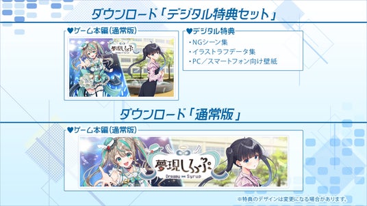 『夢現しろっぷ - Dreamy Syrup -』には、豪華特典が付いたパッケージ版や、ダウンロード版などの複数の商品をラインナップしています。