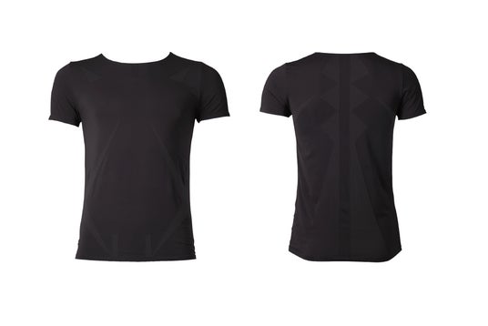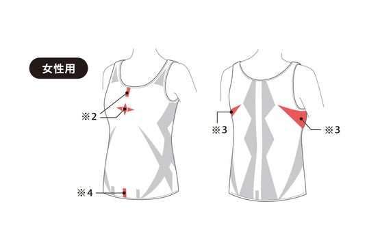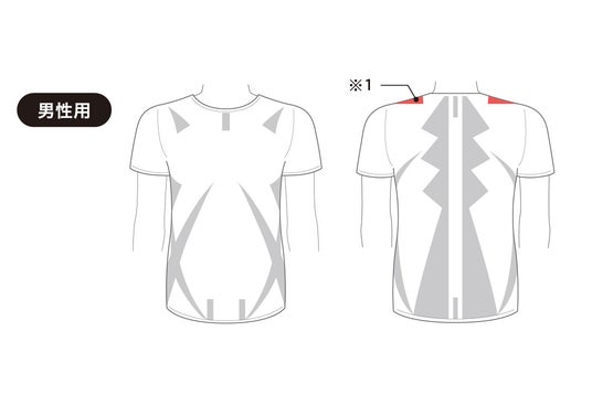 デザインのように配されている生地の凹凸が皮膚の感覚センサーにサインを送ることで、直接皮膚に触れていなくても筋肉へアプローチし、本来の姿勢へ導きます。とくに、男性用は肩が引き上がらないよう僧帽筋(※1)をサポート。女性用は、胸の中心部の胸骨(※2) と、サイドの広背筋(※3)部分を強化しています。