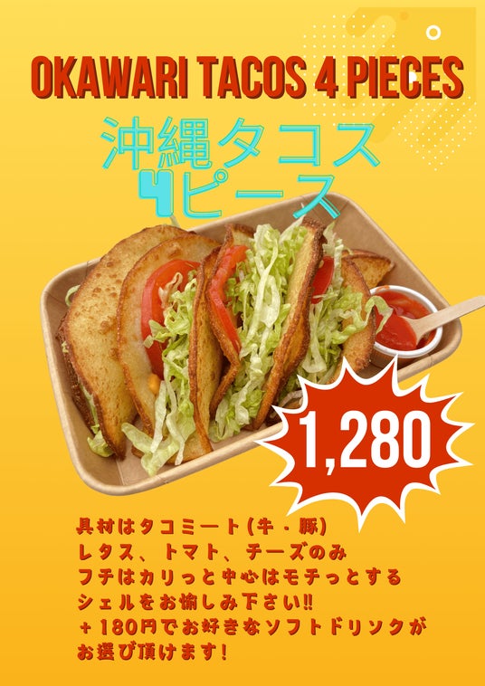 価格は沖縄タコス4ピース1280円(税込)さらに+180円で好きなソフトドリンクが選べるお得なセットもご用意しています。浅草グルメを楽しみたい方には、食べ歩きおやつにぴったりの2ピースセット680円(税込)もご用意しております。