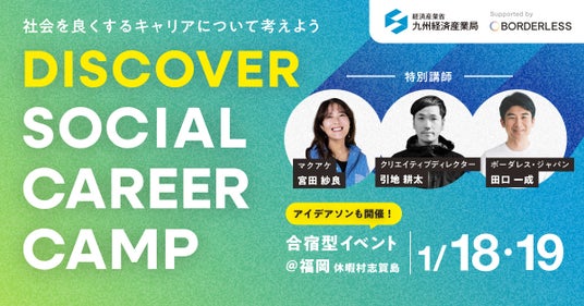 世界13カ国で50のソーシャルビジネスを展開する株式会社ボーダレス・ジャパン(所在地:福岡県福岡市、代表取締役:田口一成、以下:当社)は、九州経済産業局「令和6年度技術開発調査等推進事業」を受託し、事業企画・運営を行っています。この度、学生・若手ビジネスパーソンが地域や所属を超えて同世代の仲間たちと出会い、社会課題を解決するビジネスの実践方法や自分らしいキャリアのヒントを探る合宿イベント「DISCOVER SOCIAL CAREER CAMP」を1月18日(土)~19日(日)に開催することをお知らせします。