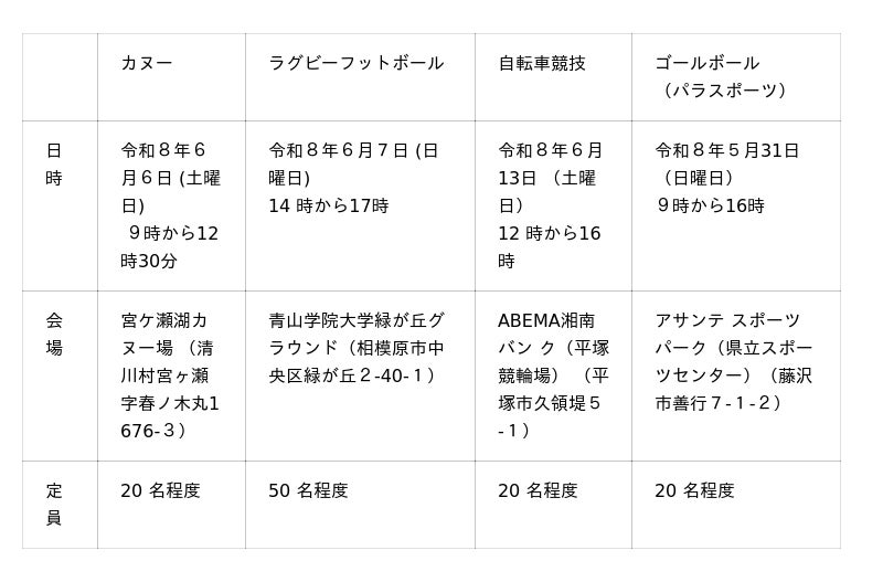 県では、新たな競技に挑戦したい中学生・高校生等を対象に、優れた能力を有する人材を発掘するため、令和8年度種目別トライアウト(選考会)の参加者を募集します。選考を通過した方に対し、アドバンスプログラム(種目別の育成)により、計画的にトップアスリートとして必要な資質・能力の向上・育成を図り、オリンピック・パラリンピック競技大会等の国際大会や全国大会等で活躍する神奈川育ちのトップアスリートの輩出を目指します。