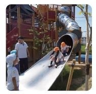 トンネル型のすべり台。カーブや直線を組み合わせたスリリングなチューブ内をすべる一瞬の間に、いろいろな感覚を楽しむことができる遊びです。