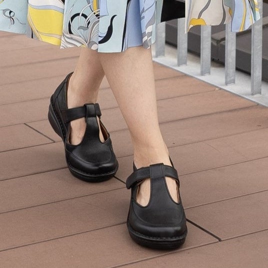 甲をしっかり固定でき、機能性も安定感も抜群のデザイン。お仕事用のシューズとしてもおすすめです。T字のアンクルストラップは、足元をスラっと綺麗に見せるだけでなく、程よいホールド感で、歩行をサポートしてくれます。