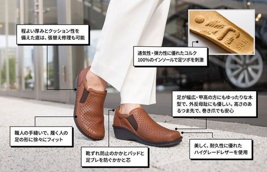 外反母趾・内反小趾の関節部を圧迫しないよう、切り替えやステッチを入れない工夫をしています。踵周りには固めの芯が入っており、左右の足ブレを防ぎます。