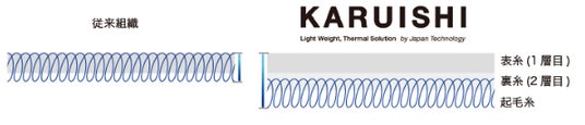 従来の編組織と全く異なる特殊編組織・起毛加工素材となっています。従来組織に比べ、起毛に使う糸をより長く編立することが可能となり、その長さの差が保持できる空気量の差となるため、高い保温性と軽量性を実現しました。