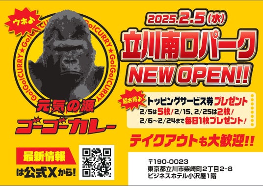 株式会社ゴーゴーカレーグループ(本社:石川県金沢市、CEO兼代表取締役社長:西畑誠、以下 ゴーゴーカレー)は、2025年2月5日に立川初出店となるゴーゴーカレー立川南口パークをオープンします。