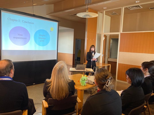 国際コミュニケーションコース長の江口真理子教授は「島根県立大学国際関係学部国際コミュニケーションコースの学生がどのような知識と技術を身につけているかを知らせる良い機会となった」と発表会の意義を語りました。