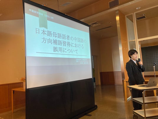 2025年1月29日(水)、第一回国際コミュニケーションコースの優秀卒業研究の発表会が開催され、5名の学生たちが、国際コミュニケーションコースの1~4年生と教員に向けて、堂々と卒業研究の成果をプレゼンテーションしました。