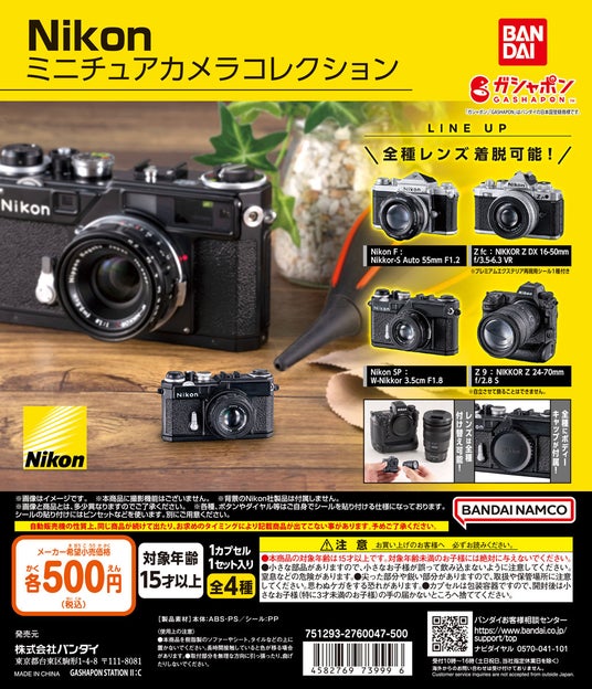 株式会社バンダイ ベンダー事業部(本社:東京都台東区)は、株式会社ニコン(本社:東京都品川区)が製造・販売するカメラをミニチュア化した「Nikon ミニチュアカメラコレクション」(1回500 円・税10%込、全4種)を2024年12月第4週より、全国のガシャポンバンダイオフィシャルショップ、玩具売場、量販店、家電店などに設置されたガシャポン自販機シリーズにて発売いたします。