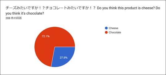 「これはチーズだと思いますか?チョコレートだと思いますか?」と質問したアンケートでは、チョコレート72.1%、チーズ27.9%(※回答数208)という結果に。一方で、「どちらとも言える!」という意見も多く、「味と見た目はチョコレートで、食感はクリームチーズ」といったコメントもありました。