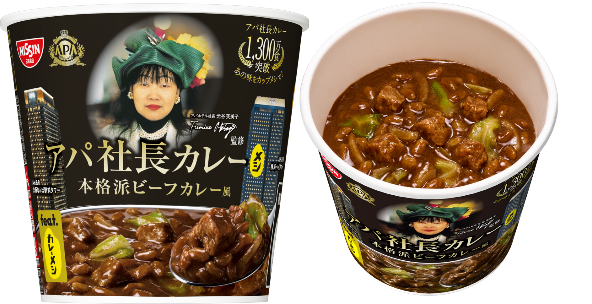 アパホテルネットワークとして全国最大の1,024ホテル140,097室(建築・設計中・海外、アパ直参画ホテルを含む)を展開するアパホテル株式会社(本社:東京都港区赤坂3-2-3、社長:元谷 芙美子)は、日清食品株式会社(本社:東京都新宿区新宿6-28-1、社長:安藤 徳隆)が12月15日(月)に全国で発売する「日清カレーメシ」シリーズの新商品「アパ社長カレーメシ 本格派ビーフカレー風」を監修しました。