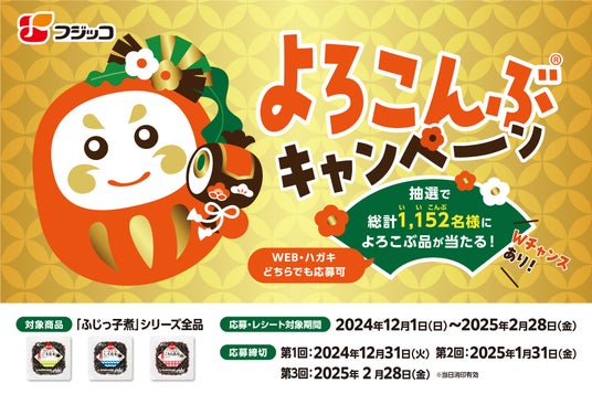 フジッコ株式会社(本社:神戸市中央区/代表取締役社長執行役員:福井正一)は、古くから縁起物とされてきた「昆布」にちなんで、総計1,152(いいこんぶ)名様に当たる『よろこんぶキャンペーン』を2024年12月1日(日)~2025年2月28日(金)で実施いたします。