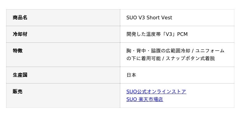 胸・背中・脇腹を広範囲に冷却!新開発の温度帯「V3」搭載で冷却感と持続力を両立した「SUO V3 Short Vest」新発売