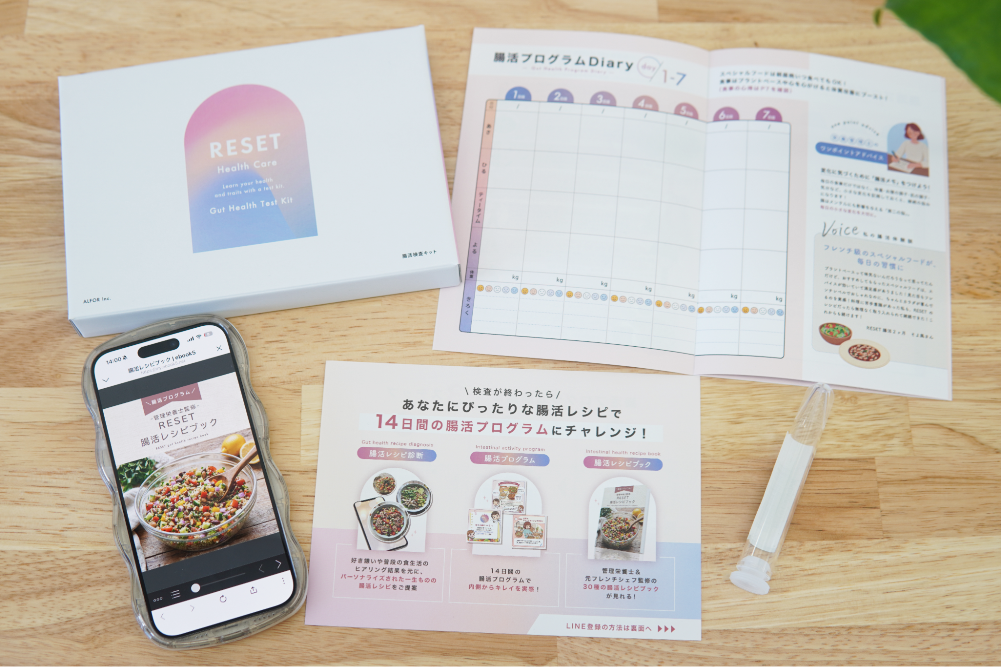 また、検査結果の確認後には、LINEを通じて腸活レシピ診断と14日間の腸活プログラムを利用でき、日常の食習慣改善までサポートします。