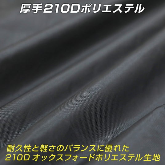 自転車だけでなく、カバー自体の劣化を防ぐためにも重要なのが生地の素材。当商品はオックスフォードポリエステル210D生地を採用しており、厚手で破れにくいのが特徴です。(自転車カバーで広く使われている190Tの生地と比較した場合)。生地の表面には撥水加工を施し、縫い目から雨水の侵入を防ぐために止水テープ加工をすることで、防水性を高めています。