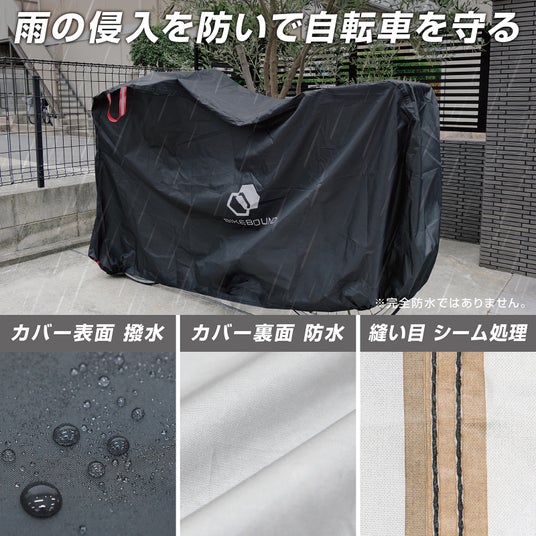 新発売の「自転車カバー」は、幅広いタイプの自転車に対応したアイテムです。本体には、耐久性・撥水性に比較的優れた生地を使用。さらに、縫い目に止水テープ加工を施したダブル防水対策により、雨風による自転車の劣化を防ぎます。※エントリーモデルには、止水テープ加工はありません