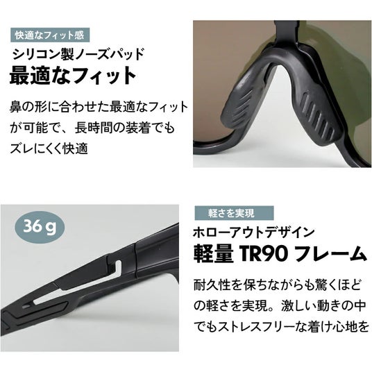 フレーム TR90(超軽量&高弾性)| レンズ PC(ポリカーボネート)| ノーズパッド シリコン | テンプル本体 TR90 | テンプル内側(イヤーフック部分) ラバー