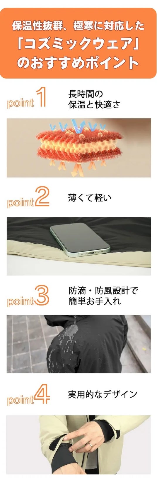 ◆ 航空宇宙素材「ポリアミド」で優れた断熱保温性を実現!!【コズミックジャケット】