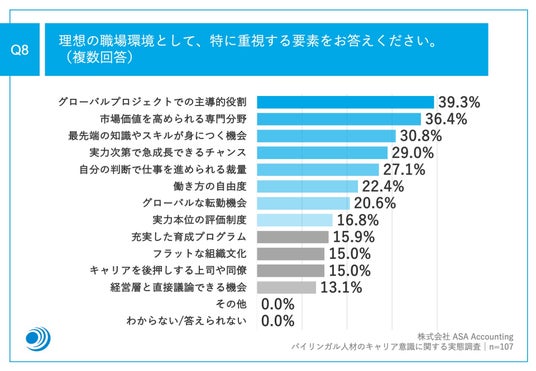 「Q8.理想の職場環境として、特に重視する要素をお答えください。(複数回答)」(n=107)と質問したところ、「グローバルプロジェクトでの主導的役割」が39.3%、「市場価値を高められる専門分野」が36.4%、「最先端の知識やスキルが身につく機会」が30.8%という回答となりました。