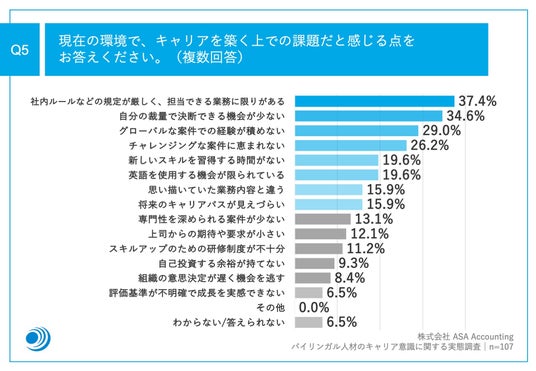「Q5.現在の環境で、キャリアを築く上での課題だと感じる点をお答えください。(複数回答)」(n=107)と質問したところ、「社内ルールなどの規定が厳しく、担当できる業務に限りがある」が37.4%、「自分の裁量で決断できる機会が少ない」が34.6%、「グローバルな案件での経験が積めない」が29.0%という回答となりました。
