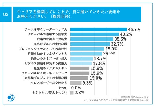 「Q2.キャリアを構築していく上で、特に磨いていきたい要素をお答えください。(複数回答)」(n=107)と質問したところ、「チームを導くリーダーシップ力」が46.7%、「グローバルで通用する語学力」が40.2%、「戦略的な視点と決断力」が35.5%という回答となりました。