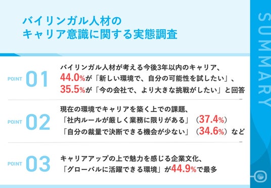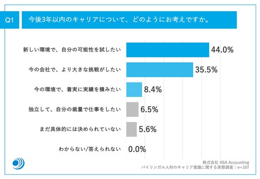 - 01|バイリンガル人材が考える今後3年以内のキャリア、44.0%が「新しい環境で、自分の可能性を試したい」、35.5%が「今の会社で、より大きな挑戦がしたい」と回答