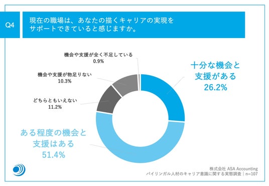 「Q4.現在の職場は、あなたの描くキャリアの実現をサポートできていると感じますか。」(n=107)と質問したところ、「十分な機会と支援がある」が26.2%、「ある程度の機会と支援はある」が51.4%という回答となりました。