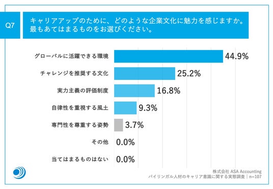 「Q7.キャリアアップのために、どのような企業文化に魅力を感じますか。最もあてはまるものをお選びください。」(n=107)と質問したところ、「グローバルに活躍できる環境」が44.9%、「チャレンジを推奨する文化」が25.2%、「実力主義の評価制度」が16.8%という回答となりました。