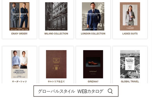 グローバルスタイルでは、以下の商品カタログ(WEBカタログ)もご覧いただけます。メンズオーダースーツ、オーダーシャツ、オーダーシューズ、そしてレディースオーダースーツなど、幅広いラインアップをご用意しています。