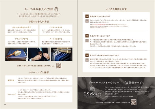このパンフレットでは、グローバルスタイルの会員様がご利用いただけるサービス、お得なポイント制度のみならず、スーツのお手入れ情報やスタイルブックなどを豊富にご案内しております。