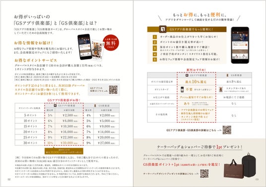 ご注文受け取りの際、テーラーバックとショッパーをご持参いただくとGS倶楽部ポイントを+1ポイント(10,000円お買い上げ相当分)進呈させていただきます。