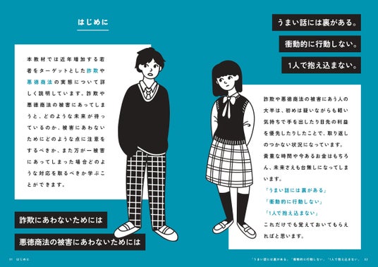 本教材では、実例を交えながら詐欺や悪徳商法の実態を詳しく説明しており、被害にあわないためにどのような点に注意するべきか、また万が一被害にあってしまった場合どのような対応を取るべきかを、学ぶことができます。