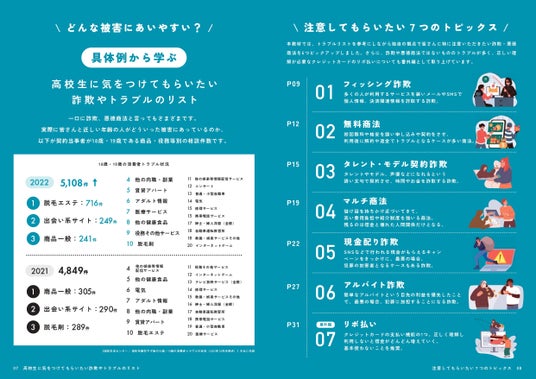 成年年齢引き下げに伴う詐欺や悪徳商法の被害、近年増加傾向にある特殊詐欺の加害に関する具体的な事例がわかりやすく説明されている本冊子を活用して、生徒たちが自己防衛の大切さを理解し、判断力を養うために役立てることを願っています