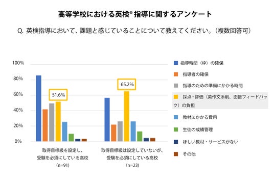 全国の高等学校を対象に行った調査(※3)では、英検対策を行っている学校で、「採点・評価(英作文添削・面接フィードバック)の負担」が課題として挙げられました。ライティングとスピーキングは独学が難しく、個別に指導するには時間を要するため、学校現場では負担となっているのが現状です。