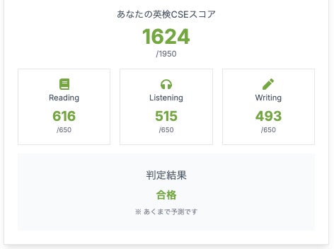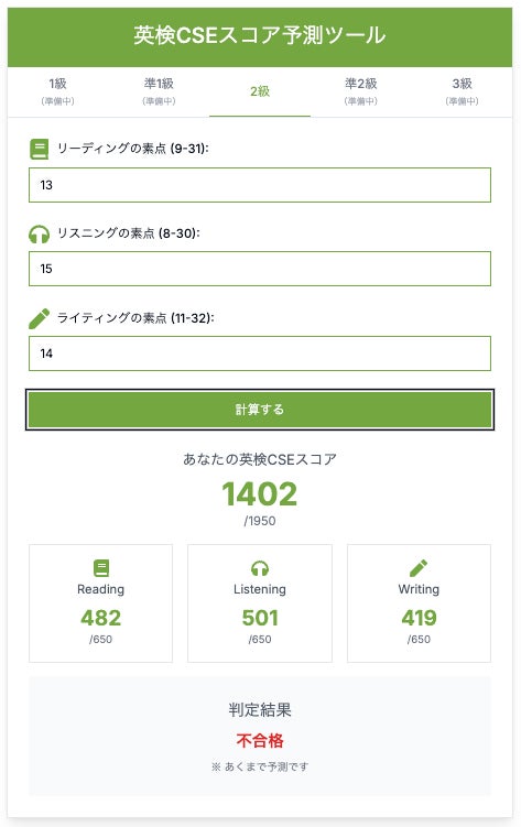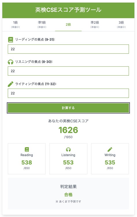 本ツールのCSEスコア算出は英検(R)公式の計算式に基づくものではなく、過去の受験者データをもとに近似値を算出しています。情報は慎重にチェックしておりますが、あくまで参考情報としてご活用ください。正式な結果は、英検(R)協会が発表するスコア・合否結果をご確認ください。