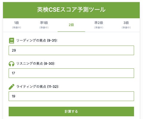 英検(R)試験の自己採点結果を入力するだけで、リーディング・リスニング・ライティングの素点をもとにCSEスコアを算出します。