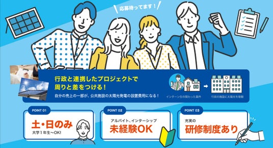 太陽光発電や蓄電池など、エコリフォーム事業をメインに展開する「株式会社九州エネルギーパートナーズ」(熊本市南区、代表取締役:矢野 嘉宏)が、行政と連携した「おひさまサポートプロジェクト」を始動。人材教育プログラムも充実した同社で、今回新たにスターティングメンバーとして学生インターンを募集開始します。
