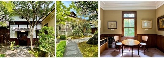 数寄屋風書院造りの建物には、国産拇材(ぼざい=ツガ)が使われ、襖の取手や釘隠しにも独創的な金物が施されるなど、当邸が檉一郎氏の京都での交友関係の拠点として力を入れて建てられたことが伺えます。 また、お庭には建築以前から自生していたと考えられる樹齢百五十年を超える椋の大木や、新たに本家西尾八ツ橋が八ツ橋の由来として再現した「かきつばたの池」などをご覧いただけます。