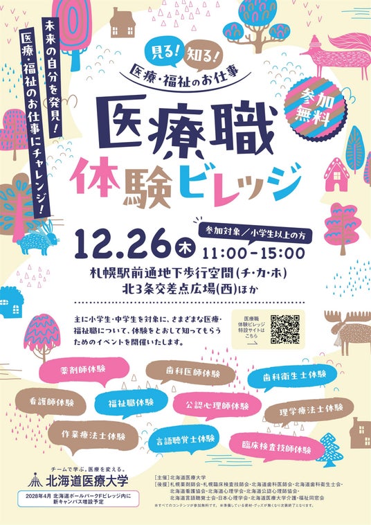 北海道医療大学は、12月26日(木)に『医療職体験ビレッジ』を開催いたします。このイベントは、北海道医療大学が養成する医療系職種(薬剤師、歯科医師、看護師、社会福祉士、公認心理師、理学療法士、作業療法士、言語聴覚士、臨床検査技師、歯科衛生士)に対する職業理解を深めることを目的としており、小学生から高校生、さらには広く一般の方々にも医療職や医療の学び・研究について学んでいただく機会を提供いたします。医療・福祉職の職業理解を深め、進路選択の一助となることを期待しております。
