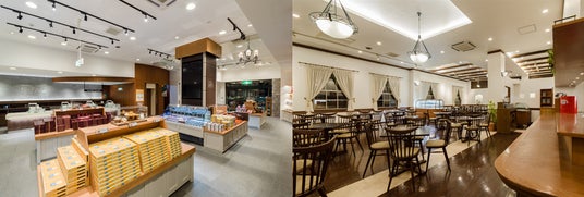 画像左は本店1階、画像右は本店2F喫茶コーナー