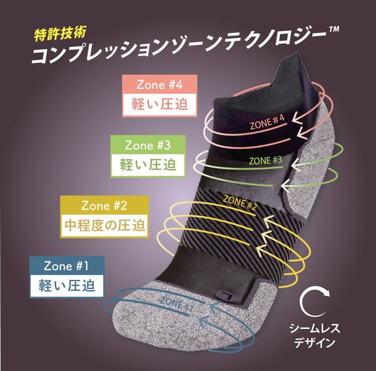 特徴1 足のトラブルの予防・緩和に対応特許技術のコンプレッションゾーンテクノロジー(TM)により特定の筋肉と関節に合わせて異なる圧力をシームレスで配置することでまるで装具のようなパフォーマンスサポート力を発揮します!