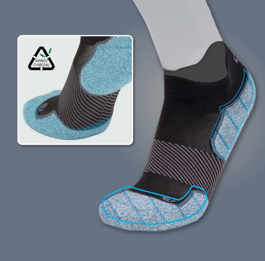 摩擦を軽減し不快な擦れを防ぐPoint3 ナノ竹炭イオン化繊維を使ったクッションゾーンがつま先・かかと底面の衝撃と摩擦を低減。衝撃吸収・吸湿・消臭に優れたナノ竹炭のクッションを使う事で摩擦を軽減し、不快な擦れを防いでくれます。