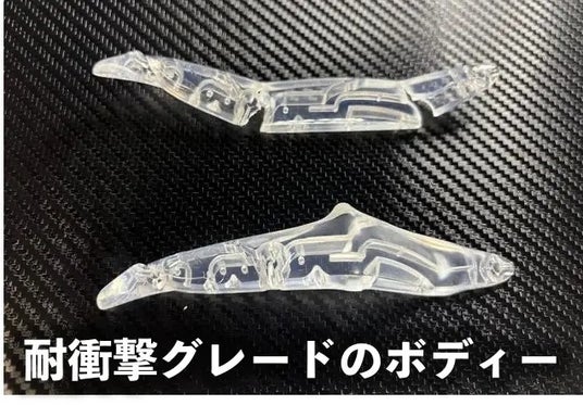 写真上のボディーがノーマルグレードのABS、下のボディーが今回使用の耐衝撃グレードのボディーを同じ強さで加圧したものです。上のボディーは完全に割れていますが、下のボディーは変形や白化はみられるものの、破断はしていません。ボディー強度について、ミスキャスト時はもちろんですが、歯の鋭い魚、磯場でのランディング時に効果を実感していただけると思います。