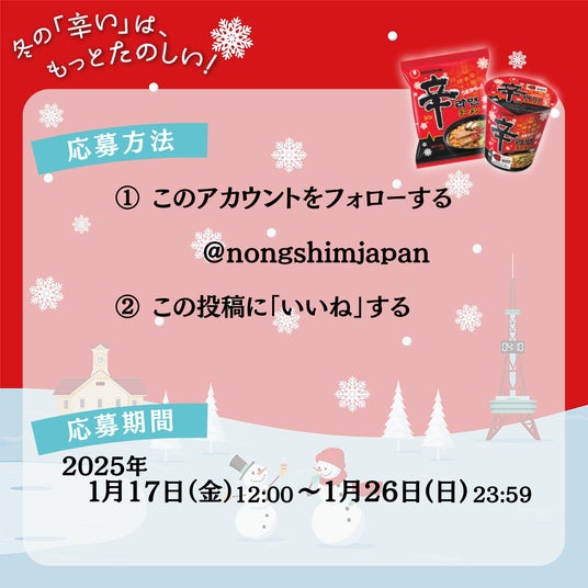 株式会社農心ジャパン(本社:東京都千代田区、代表取締役社長:金大廈)は、2月の「さっぽろ雪まつり」(北海道札幌市)にて同時開催されるスケートリンク「スマイルリンクさっぽろ」に初協賛し、過去最大級の無料試食会などでおもてなしをします。協賛を記念して、1月17日(金)~1月26日(日)の期間、辛ラーメン公式SNSにてキャンペーンを実施。Instagram・Xでご応募いただいた方から抽選で合計20名様に「冬のおすすめラーメンセット&雪まつりオリジナルグッズ」が当たります。
