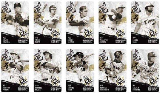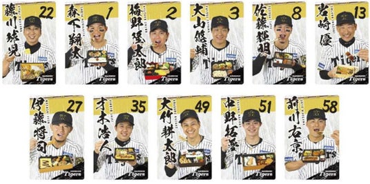 商品一覧や販売店舗はコラボグルメ特設ページをご確認ください! URL: https://koshien.hanshin.co.jp/gourmet/gourmet_player2025/ 4 限定カードデザイン 今年は球団90周年スローガンをモチーフにしたカードが登場!監督・選手カードの裏面にはコラボグルメを手にした様子が、レジェンズカードの裏面には現役時代の輝かしい成績がプロフィールと共に、それぞれデザインされています! 更に今回は現役選手カードに限り、数量限定で直筆サイン入りカードを封入しています! (1)「監督・選手コラボ弁当」対象(全11種) <表面>